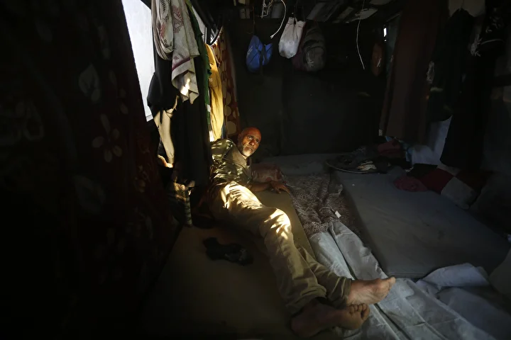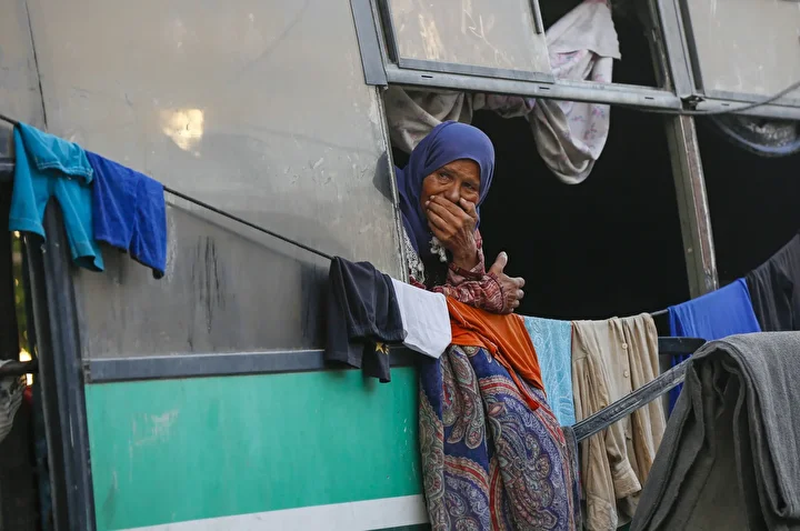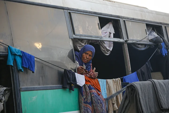 Kentte hizmet dışı kalan bir otobüs ve derme çatma çadırlara sığınmak zorunda kalan halk, zor şartlar altında yaşamını sürdürmeye çalışıyor.