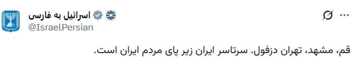 İsrail Dışişleri Bakanlığı’na ait “IsraelPersian” adlı Twitter hesabından yapılan paylaşımda, gösterilerin devam ettiği şehirlerdeki duruma dikkat çekilerek, “Kum, Meşhed, Tahran, Dezful İran’ın tamamı İran halkınındır” ifadelerine yer verildi.