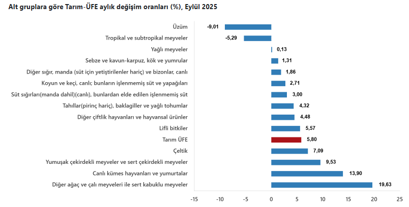Türkiye İstatistik Kurumu (TÜİK), 2025 yılı Eylül ayına ilişkin tarım ürünleri üretici fiyat endeksi (Tarım-ÜFE) verilerini açıkladı. Buna göre, Tarım-ÜFE’de (2020=100), 2025 yılı Eylül ayında bir önceki aya göre yüzde 5,80 artış, bir önceki yılın Aralık ayına göre yüzde 28,90 artış, bir önceki yılın aynı ayına göre yüzde 46,83 artış ve on iki aylık ortalamalara göre yüzde 37,98 artış gerçekleşti.